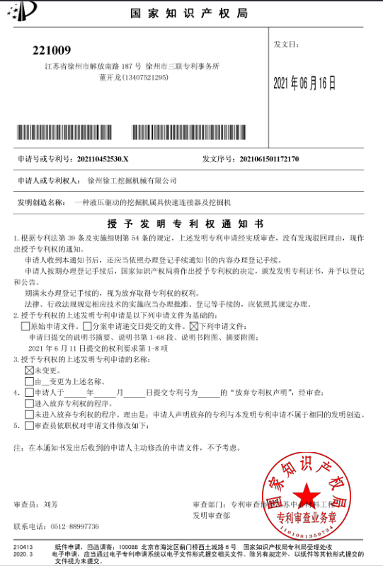 6月16日,徐州徐工挖掘機有限公司提交的發(fā)明專(zhuān)利申請CN112854328“一種液壓驅動(dòng)的挖掘機屬具快速連接器及挖掘機”獲得國家知識產(chǎn)權局授權通知書(shū),從提交申請到獲得授權通知僅用了51天,通過(guò)中國(徐州)知識產(chǎn)權保護中心的專(zhuān)利申請快速預審通道,授權周期大幅縮短,授權速度提升了近十倍! 今年3月24日,中國(徐州)知識產(chǎn)權保護中心通過(guò)了國家知識產(chǎn)權局的現場(chǎng)驗收,并于4月29日正式揭牌運營(yíng)。聚焦創(chuàng )新主體需求,徐州保護中心迅速部署,主動(dòng)服務(wù),舉辦了多次預審業(yè)務(wù)相關(guān)培訓,已有數百家企事業(yè)單位完成申請主體備案,搭上徐州地區開(kāi)往國家知識產(chǎn)權局的“高鐵”。 徐州保護中心將緊跟產(chǎn)業(yè)實(shí)際需求,打通“一站式”知識產(chǎn)權服務(wù)鏈條,促進(jìn)知識產(chǎn)權的保護、轉化與運用,讓知識產(chǎn)權點(diǎn)亮創(chuàng )新火種,助推經(jīng)濟高質(zhì)量發(fā)展。 此案件是徐州市知識產(chǎn)權保護中心開(kāi)業(yè)以來(lái)第一件授權的發(fā)明專(zhuān)利,為我公司全權代理并申請。